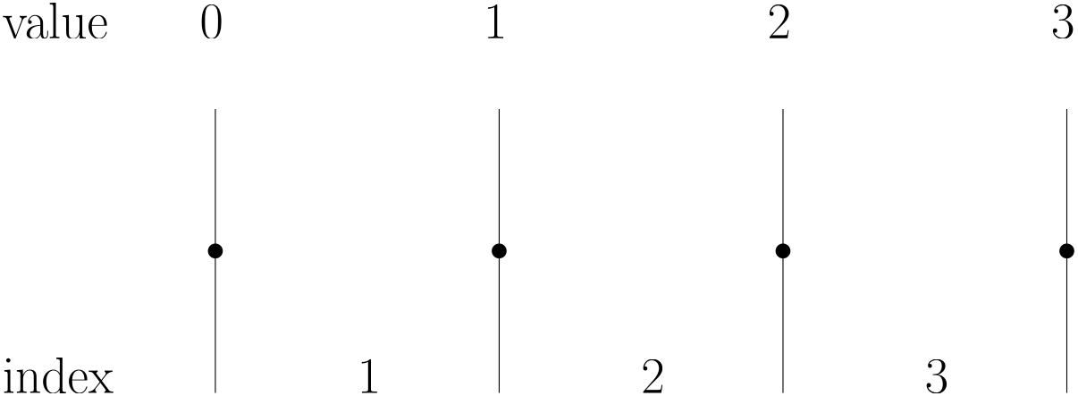is illustrated below. The values in the CSV file are represented by filled circles. Notice the required rounding places most values in the interval (array element) to the left, except for 0, which is always placed in the first interval.