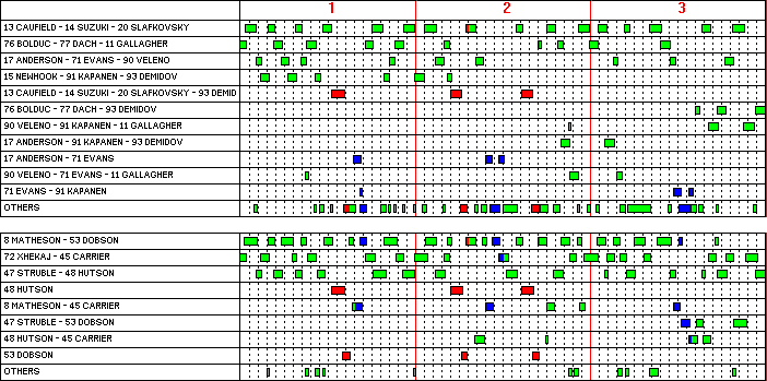 | 15 Blackwell - 12 Faksa - 11 Bastian | 1:23 | 1:20 | 0:25 | 0:53 | 0:48 | 0:08 | 1:21 | 3:15 | 2:09 | 0:11 | |||||