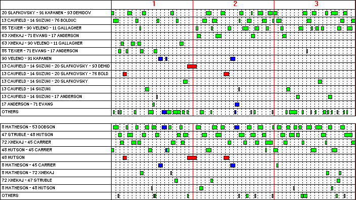 | 23 MacDermid - 89 Eller - 71 Greig | 0:13 | 0:15 | 0:30 | 1:06 | 0:03 | 1:44 | 0:13 | ||||||||
