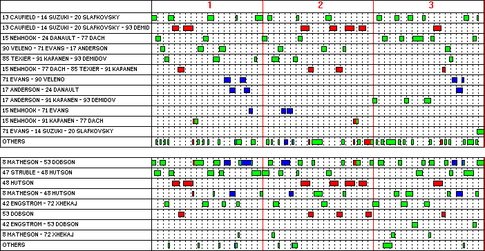 | 81 Cernak - 90 Moser | 0:31 | 0:01 | 0:40 | 0:04 | 0:01 | 0:02 | 0:52 | 0:27 | 0:09 | 0:39 | 0:03 | 0:01 | ||||